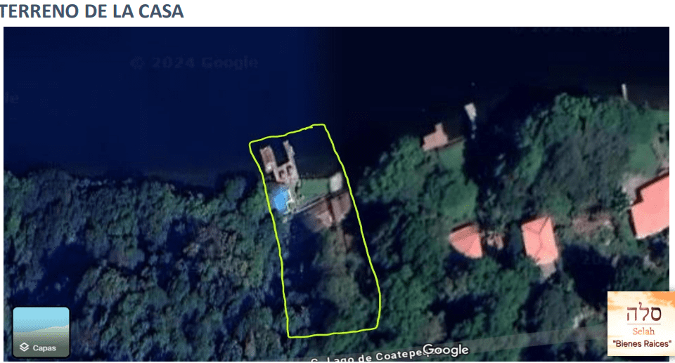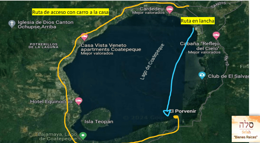 Ubicada en una zona donde se encuentran las casas mas “Exclusivas del Lago” cerca de la casa que utiliza el Presidente de la Republica y lejos de la zona de restaurantes. A la casa se puede llegar en carro con un recorrido de 50 minutos desde la entrada al Lago de Coatepeque, o en lancha a solo 12 minutos.